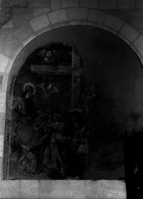 - NOTIZIE STORICO CRITICHE L'affresco scoperto negli anni '60 del sec. XX sotto una tamponatura, è privo di definizione critica. Se ne propone per la prima volta in questa sede l'attribuzione al Pastura in una data prossima al periodo in cui il pittore eseguì gli affreschi nel Duomo di Tarquinia. Analogie stilistiche vi sono confermate per esempio ponendo a confronto i personaggi dell'affresco con le Sibille, l'Angelo Annunziante che il Pastura eseguì per il Duomo di Orvieto nel 1497. Si pensi anche all'affresco con Madonna, Bambino, Santi e S. Girolamo nel Museo Civico di Viterbo. A questa data Pastura orbita nell'area di Luca Signorelli. Si vedano in proposito: Tiziani G., Antonio da Viterbo, il Pastura, il Fantastico e Monaldo Trofi a Tarquinia, un Pro Tarquinia, IX, 1985, n. 5, p. 3; Faldi I., Pittori viterbesi di cinque secoli, 1970, p. 43, fig. 169