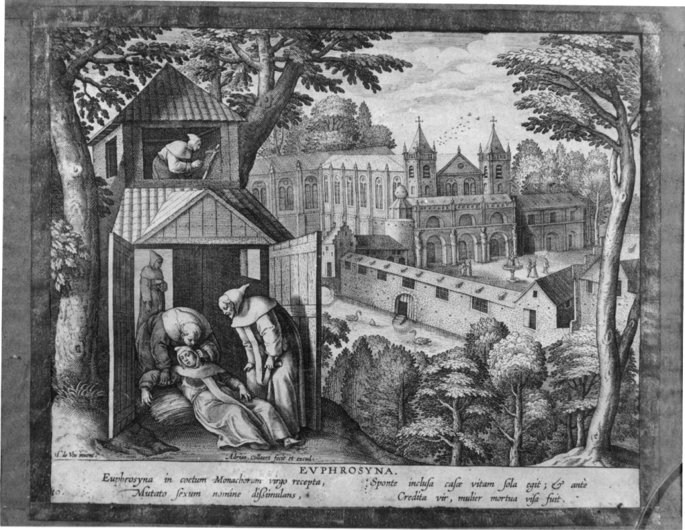 Personaggi: Eufrosina. Figure maschili: frati. Piante: alberi. Oggetti: crocifisso. Costruzioni: chiesa; romitorio