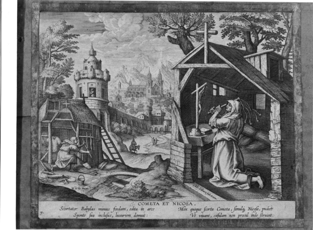 Personaggi: Cometa; Nicosa. Figure maschili. Piante: alberi. Oggetti: crocifisso; flagello; scala. Costruzioni: chiesa; romitorio; cappellina; torrione. Paesaggi: paesaggio cittadino