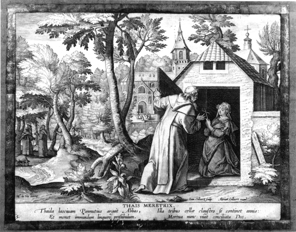 Personaggi: Taide. Figure maschili: frati. Piante: alberi. Oggetti: crocefisso. Costruzioni: chiesa; romitorio. Paesaggi: paesaggio boscoso. Ecclesiastici: abate Pannuzio
