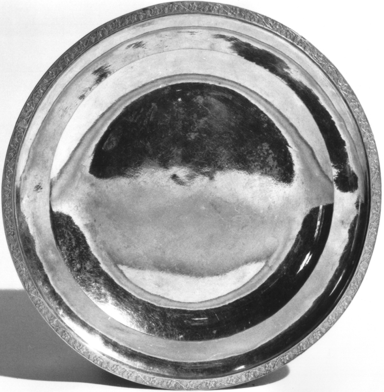 piatto liscio, decorato lungo l'orlo della tesa da una fascia cesellata con tralci di vite carichi di grappoli