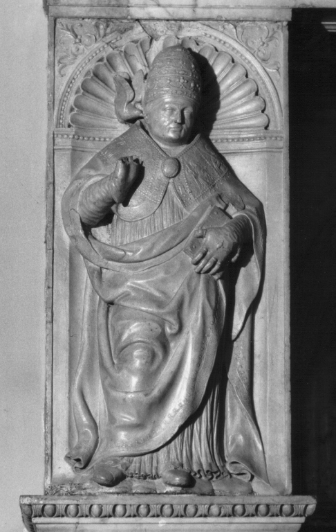 - NOTIZIE STORICO CRITICHE Il monumento fu rimosso da San Pietro in occasione della ricostruzione della basilica, o forse già sotto Niccolò V. La congregazione di San Giorgio in Alga, fondata da Gabriele Condulmer (poi papa Eugenio IV) ottenne che le spoglie e il monumento del suo fondatore venisero trasferite nel monastero di S. Salvatore in Lauro. In questa occasione i padri celestiniani fecero collocare l'iscrizione del basamento. Nonostante gli spostamenti l'opera mantiene la struttura originaria. L'attribuzione a Isaia da Pisa risulta già da fonti coeve, ma la critica è concorde nel ritenere autografe dell'artista soltanto la statua-ritratto del papa e le due sul pilastro destro. La datazione dell'opera è compresa tra la morte di Eugenio IV e quella di Niccolò V, quando risulta già realizzato il monumento