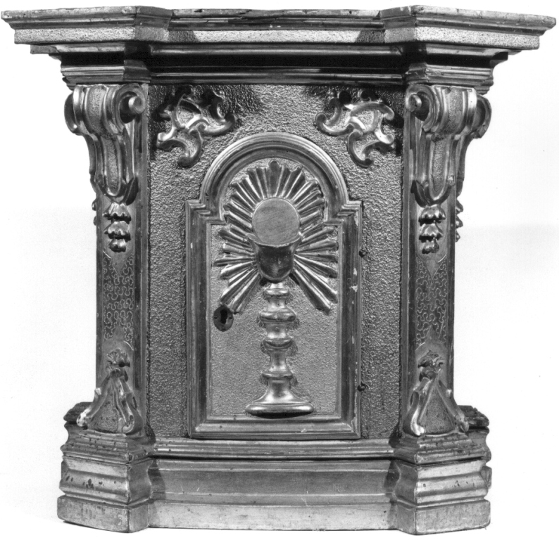 base poligonale modanata; la fronte è inquadrata da paraste poste in diagonale decorate da mensoline a voluta. Concluso da cornice modanata aggettante. Sportellino centinato, sul quale è scolpito un calice con ostia raggiata
