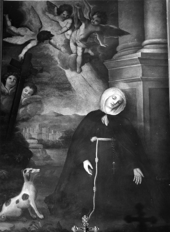 Personaggi: Santa Margherita di Cortona. Attributi: (Santa Margherita di Cortona) cane; cordone francescano. Figure: angeli. Allegorie-simboli: croce; corona di spine