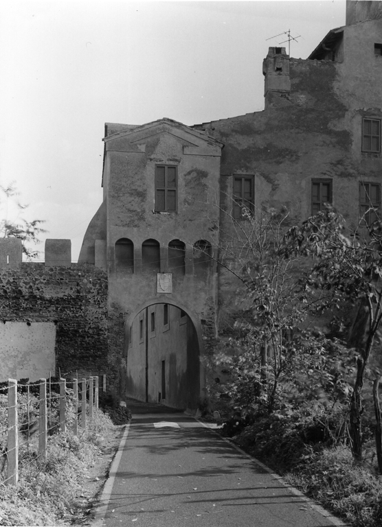 Portale di ingresso con arcature cieche e mura perimetrali con merli