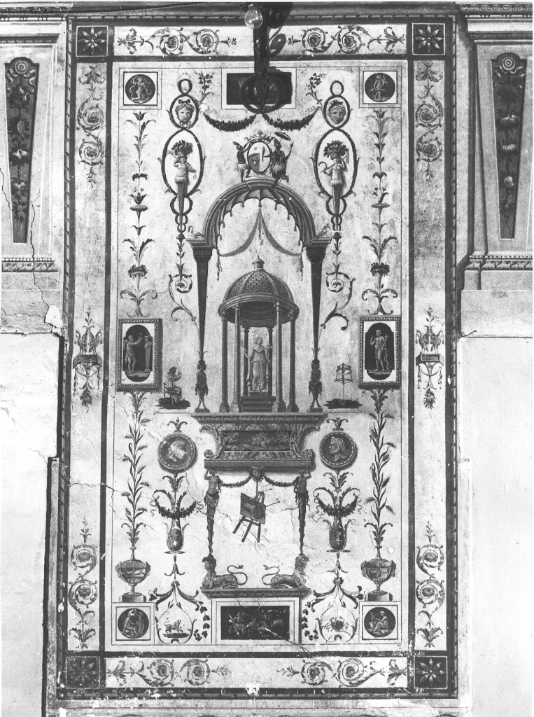 Riquadro a grottesche con cornice a girali d'acanto, coppie di pavoni; ai bordi 9 figurazioni mitologiche a monocromo entro cornice, al centro Cerere entro architettura composita aperta sormontata da stemma, con in basso appesi simboli della pittura, a destra e a sinistra erme coronate da vaso di fiori, figura maschile, a sn, con arcolaio, a dx, cammei, segno zodiacale del Leone e del Capricorno; campo con girali di acanto, vasi, festoni, spighe