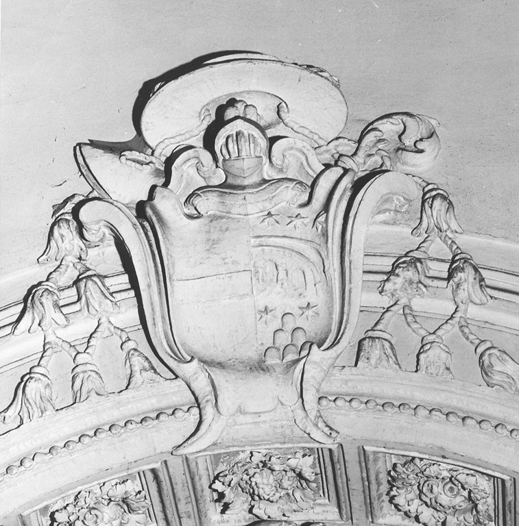 - STEMMI sopra la cornice della pala - Stemma - diviso in due campi: banda orizzontale a destra, 6 monti, 4 stelle e stella cometa con in mezzo fiume (?) che scorre sotto un ponte