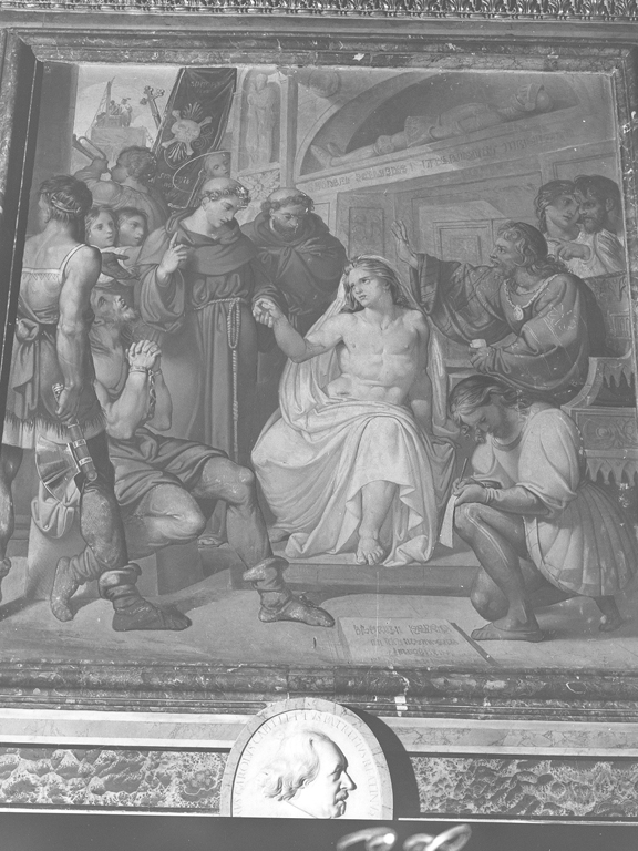 La scena si riferisce ad un momento della vita di S. Antonio. Un ragazzo viene resuscitato dal Santo che lo tiene per mano, mentre gli astanti guardano increduli; qualcuno di loro annota l'evento, altri pregano o danno l'annuncio del miracolo con le trombe