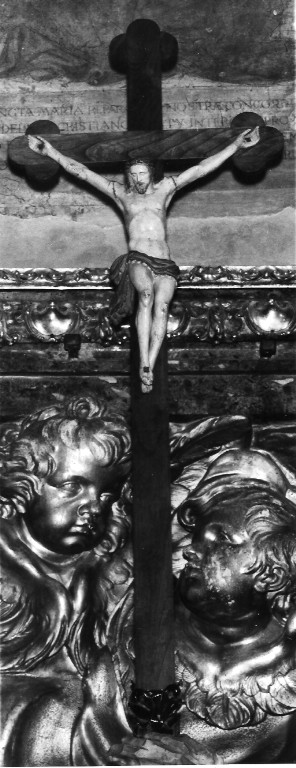 Croce a bracci polilobati con figura di Cristo caratterizzata da volto reclinato verso destra e perizoma annodato sui fianchi