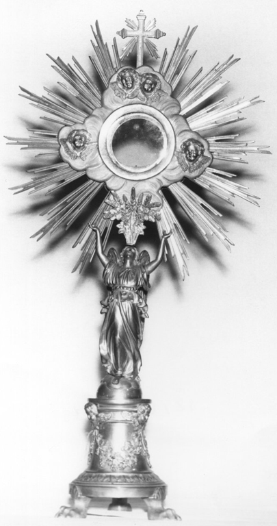 base circolare su tre piedi a zampa di leone; piede cilindrico con testine d'angelo e tralci di vite. Fusto con nodo figurato ad angelo poggiante su globo e sormontato da fascio di spighe.Teca circolare raggiata e con testine angeliche tra nubi. Crocetta apicale raggiata