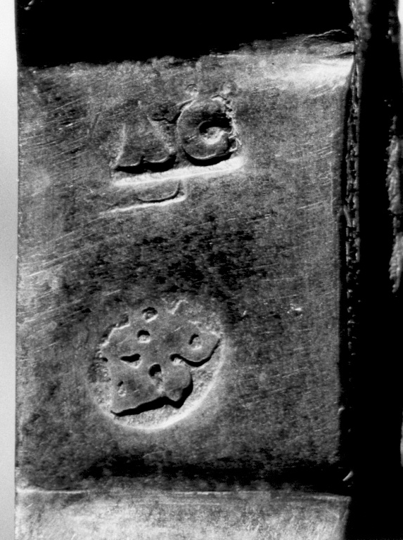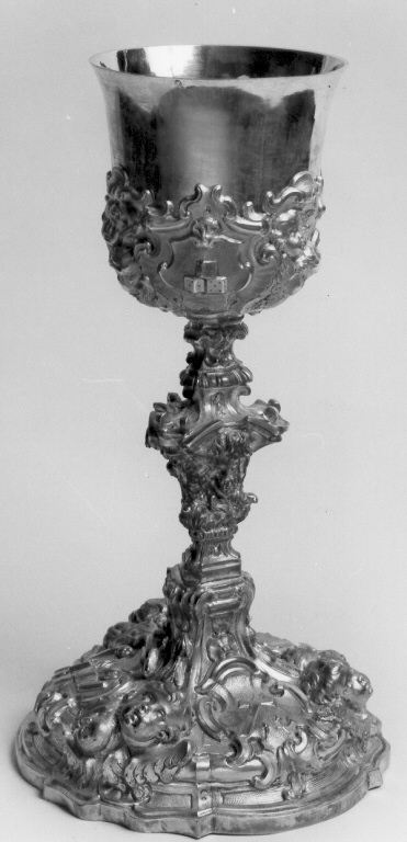 base mistilinea decorata da teste cherubiche alternate a targhe contenenti simboli della passione, ripetuti nelle targhe del sottocoppa; fusto a nodo con ricca decorazione a girali