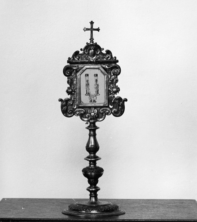 base circolare decorata con foglie fusto sagomato con nodo piriforme e a balaustro; ricettacolo con cornice sagomata a foglie di acanto e volute, teca poligonale con reliquia, terminazione con crocetta apicale