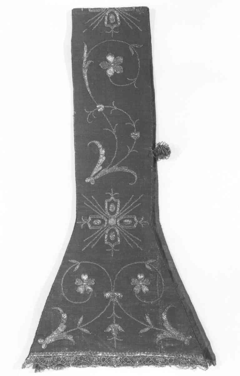 Manipolo in seta effetto gros de Tour laminata e ricamata a rilievo con motivi floreali entro volute fitomorfe. Bordo con ricamo in filo d'oro. Piccola nappa