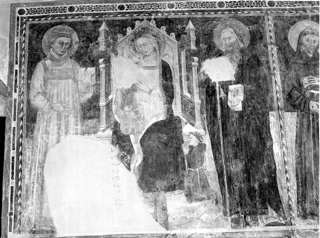 Cornice a motivi geometrici; due quadri: a sinistra, Madonna in trono con Bambino fra santi e donatore inginocchiato; a destra analoga scena frammentaria