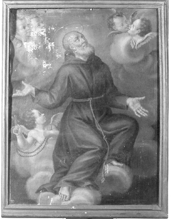 Santo anziano in saio scuro rivolge lo sguardo verso il cielo popolato da angeli; in basso, un angelo mostra una corna del Rosario