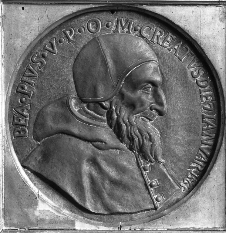- NOTIZIE STORICO CRITICHE L'opera è di mediocre qualità e va considerata prevalentemente per il suo valore commemorativo e celebrativo. Essa è inoltre anche difficilmentevdat abile proprio per mancanza di pregnanti caratteri stilistici. Non è indica tivo il fatto che nell'opera il pontefice sia indicato come beato e non sa nto, il che suggerirebbe per l'opera stessa una datazione tra il 1672 ed i l 1712 ovvero il periodo di tempo che passò tra la beatificazione (1672) e la canonizzazione (1712); ma il rilievo non sembra sei-settecentesco. Pot rebbe quindi trattarsi di un'opera più tarda eseguita su un modello, ignot o alla scrivente, eseguito proprio tra il 1672 e il 1712