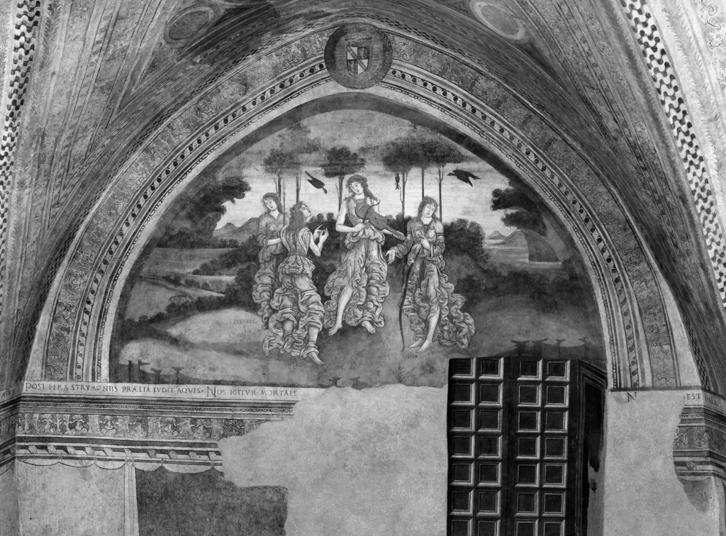- NOTIZIE STORICO CRITICHE Parte della decorazione da riferire sempre a Desiderio da Subiaco, come gli altri affreschi della sala, che presenta aspetti della cultura pinturicchiesca come gli uccelli in volo ritagliati in sottili sagome e come gli elementi del paesaggio e gli atteggiamenti delle figure. Tali elementi consentono di avanzare l'ipotesi che questa impresa venne realizzata dopo il 1494 e cioè in una data successiva al cantiere dell'appartamento Borgia
