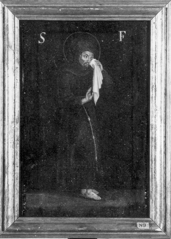 Il Santo piangente è raffigurato in posizione eretta, rivolto verso sinistra, su fondo scuro. La mano sinisatra impugna un fazzoletto con cui si asciuga le lacrime. La stesura del colore è piuttosto piatta. Ai lati della aureola sono dipinte le lettere S e F