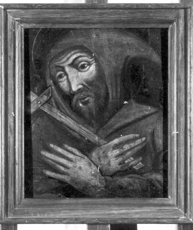 Il Santo è raffigurato a mezzo busto con il capo coperto dal cappuccio e le mani stigmatizzate