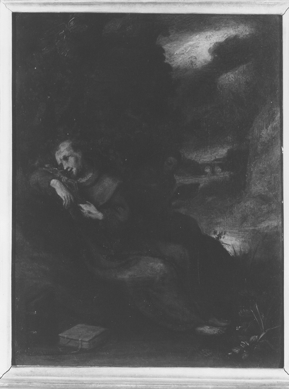 Il Santo è seduto all'interno di una grotta e volto verso sinistra, contempla il crocifisso che tiene tra le braccia. In secondo piano si intravede la figura di un monaco intento nella lettura. Il paesaggio notturno sulla destra comprende un corso d'acqua e, in lontananza un ponte appena rischiarato dalla luce della luna