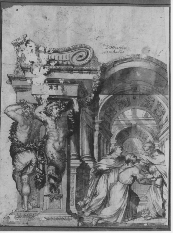 Personaggi: san Francesco d'Assisi; san Domenico; sant'Angelo. Decorazioni: coppia di telamoni
