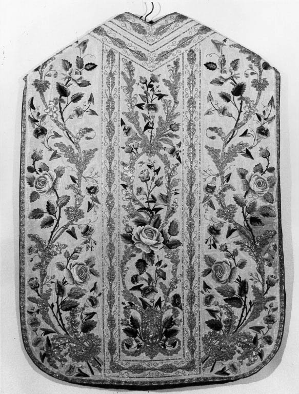Pianeta in seta bianca ricamata a motivi di tralci fioriti in oro e vari colori