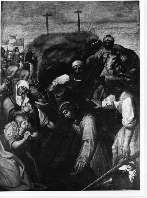 Personaggi: Gesù Cristo. Figure femminili: pie donne. Montagne: Calvario. Paesaggi