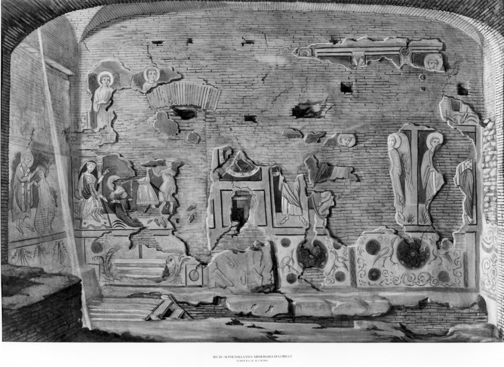 - NOTIZIE STORICO CRITICHE L'acquarello rappresenta la parete di fondo della navata sinistra prima che ne fosse aperto il varco di accesso al Mitreo. La ricostruzione della scena del re in trono con la figura inginocchiata, identificata da padre Mulllooly come San Cirillo davanti al re Michele, viene criticata da Wilpert (1906); si tratterebbe infatti di una parte restaurata in seguito all' apertura della porta di accesso al Mitreo. Secondo Wilpert la figura inginocchiata sarebbe una donna e la scena rappresenterebbe Esther ed Assuero