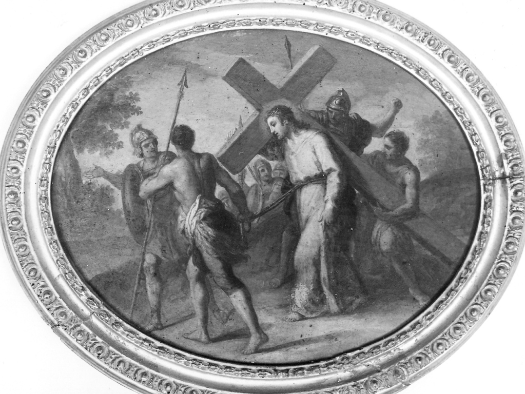 Personaggi: Gesù Cristo; Simone il Cireneo. Figure: soldati; carnefice. Armi: lance; scudi. Strumenti del martirio: croce; corona di spine