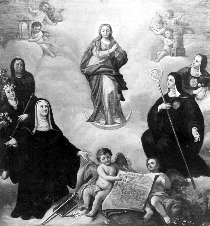 Personaggi: Madonna Immacolata. Figure: sante benedettine; angeli. Oggetti: disegno con veduta del Sacro Speco; pastorali; libro; torre; tempietto. Fiori. Fenomeni metereologici: nuvole