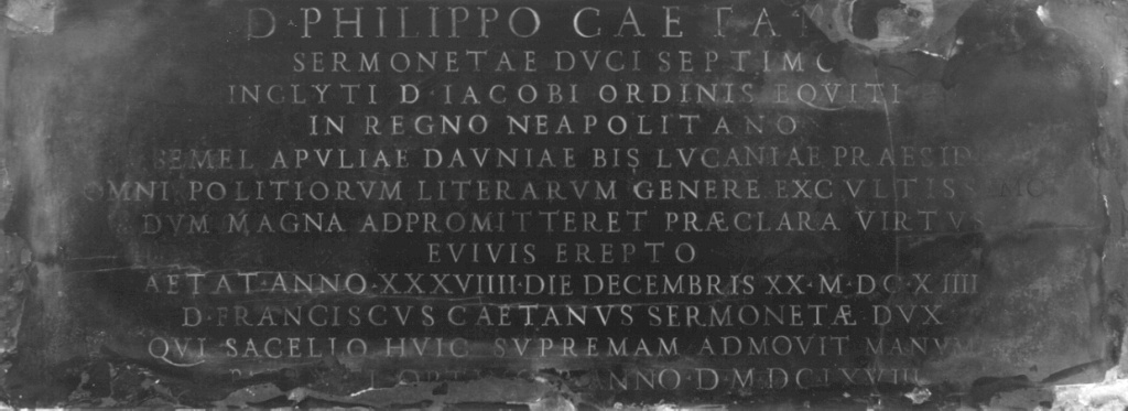 - ISCRIZIONI al centro della lastra - D. PHILIPPO CAETA(...)/ SERMONETAE DVCI SEPTIMO/ INCLYTI D. IACOBI ORDINIS EQVITI/ IN REGNO NEAPOLITANO/ (...)EMEL APVLIAE DAVNIAE BIS LVCANIAE PRAESID(...)/ OMNI POLITIORVM LITERARVM GENERE EXCVLTISSIMO/ DVM MAGNA ADPROMITTERET PRAECLARA VIRTVS/ EVIVS EREPTO/ AETAT ANNO XXXVIIII DIE DECEMBRIS XX MDCXIIII/ D. FRANCISCVS CAETANVS SERMONETAE DVX/ QVI SACELLO HVIC SVPREMAM ADMOVIT MANVM/ (...)NNO D. MDCIXVIII - lettere capitali - a solchi - latino