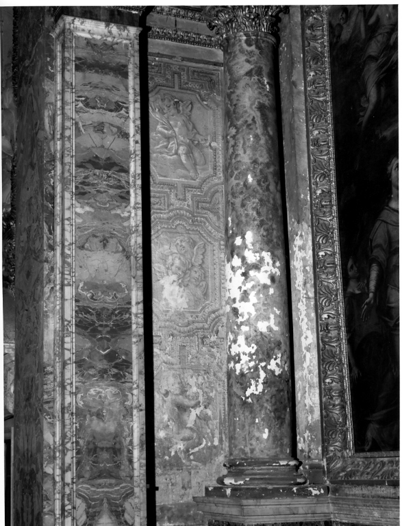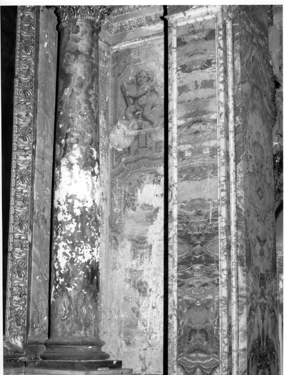 semplice mensa fiancheggiata da plinti; su questi, due colonne, con capitelli compositi, sorreggono trabeazione e timpano triangolare spezzato al centro. Sopra il doppio gradino d'altare, cornice quadrangolare per la pala