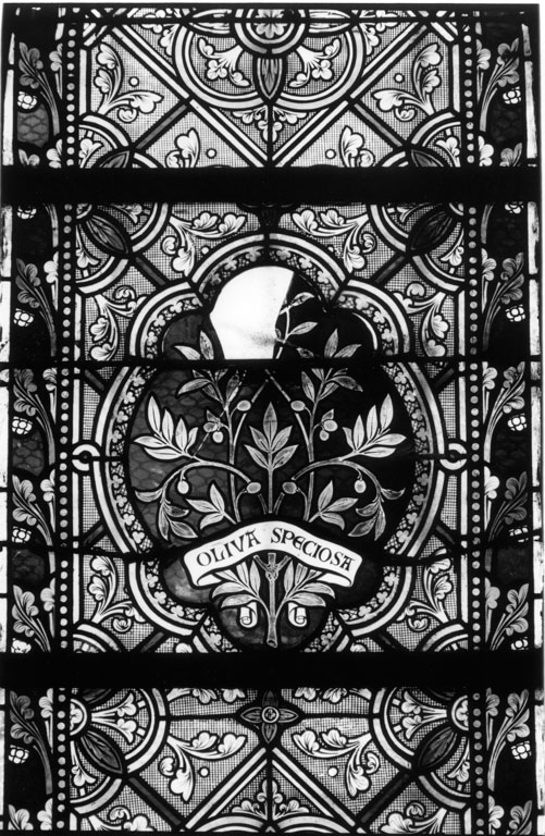 La vetrata, di forma ogivale, presenta un disegno a motivi vegetali entro cerchi e losanghe; al centro, cornice mistilinea contenente rami d'ulivo e cartiglio