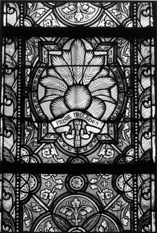 La vetrata, di forma ogivale, presenta un disegno a motivi vegetali entro cerchi e losanghe; al centro, cornice mistilinea contenente fascio di foglie di palma e cartiglio