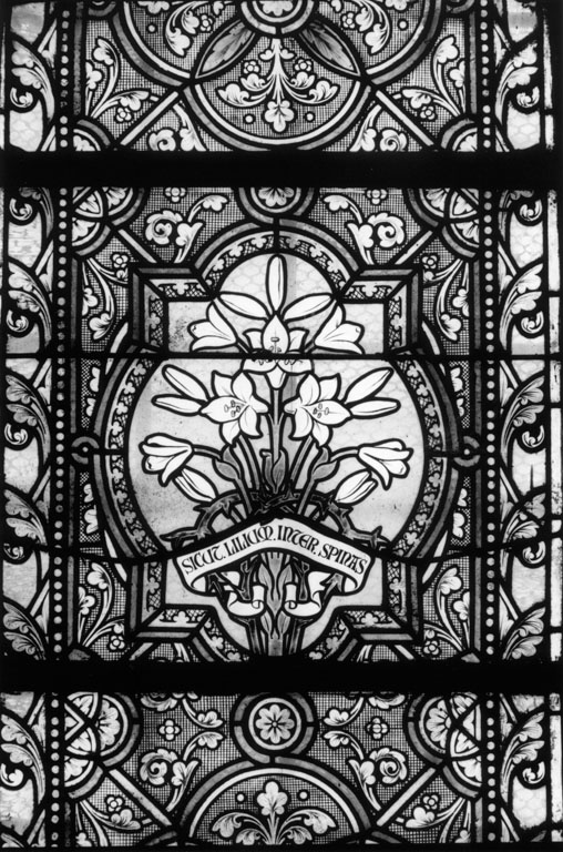 La vetrata, di formato ogivale, presenta un disegno a motivi vegetali e geometrici; al centro, cornice mistilinea contenente un mazzo di gigli con corone di spine e cartiglio