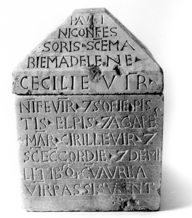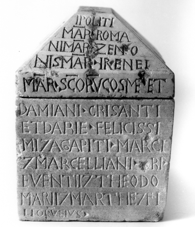 - NOTIZIE STORICO CRITICHE Sull'iscrizione sono citate reliquie di protomartiri così numerosi ed importanti da suggerire che si trattasse di reliquie "ex contactu". Nell'epigrafe, scritta in un latino corretto ed eseguita da un quadratario, compaiono i titoli di "papa" e di "confessor" unito a "martyr", circostanza che suggerisce una datazione posteriore al IV secolo. I caratteri epigrafici orientano verso una collocazione ancor più tarda. La capsella è stata reimpiegata, come testimonia il fatto che le lettere aggirano alcuni punti sbrecciati del marmo; è probabile quindi che in origine fosse un'urna cineraria pagana. Non si riscontrano tracce di precedenti epigrafi