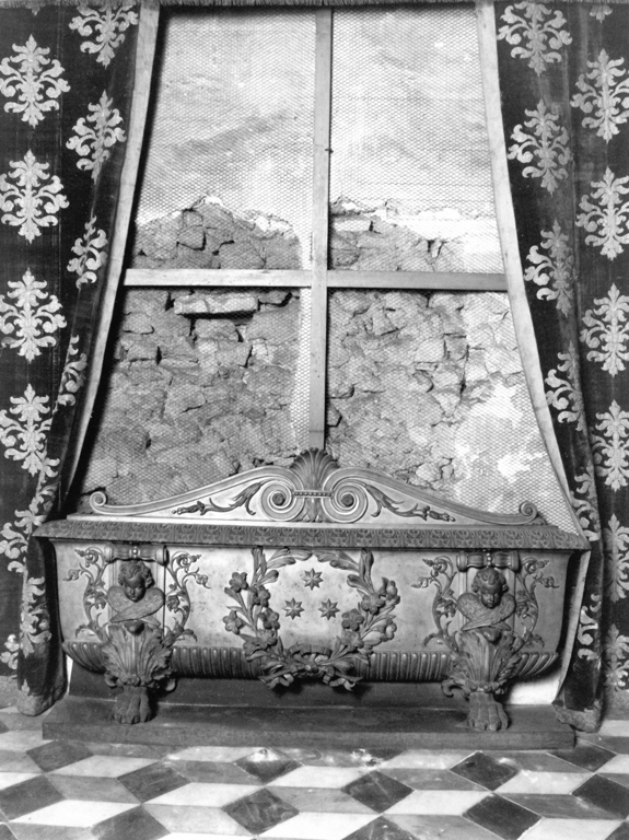 fronte decorata al centro da clipeo ornato da gigli contenenti tre stelle, zampe leonine da cui si dipartono racemi con al centro teste cherubiche, coperchio con voluta laterale