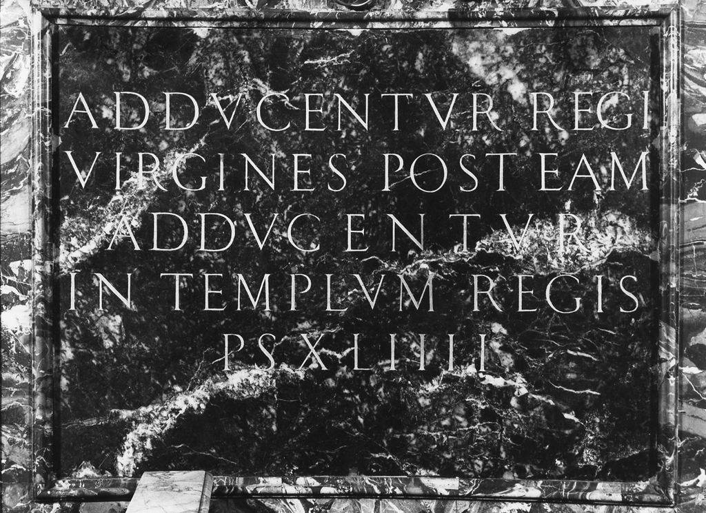 L'opera ha una ricca cornice in marmo al di sotto della quale è presente una lastra con un'iscrizione