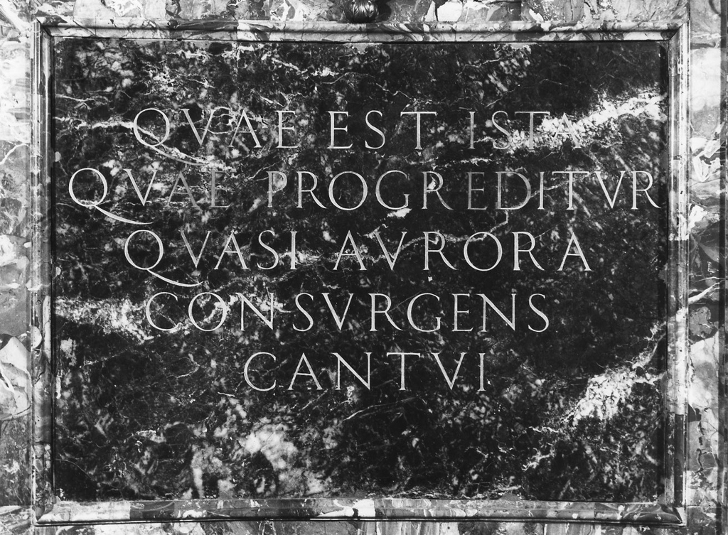 L'opera ha una ricca cornice in marmo al di sotto della quale è presente una lastra con un'iscrizione
