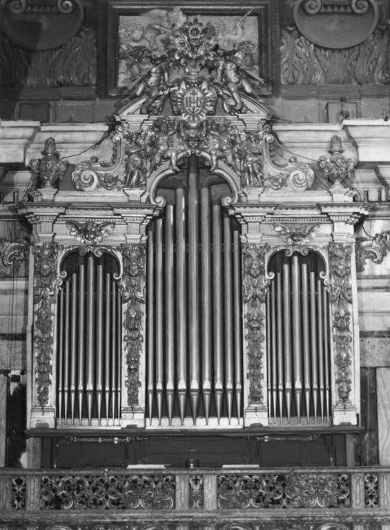 Collocato al di sopra di una cantoria ha la fronte spartita in tre cavità cuspidate attraverso le quali si vedono le canne. Festoni di fiori e frutta terminanti con un cherubino corrono lungo le colonnine che separano le aperture ed un cherubino si trova anche alla sommità delle aperture laterali. Lo spazio al centro tricuspidato e ingentilito da volute è caratterizzato inoltre dalla presenza di due angeli che sostengono ed indicano con una mano lo scudo entro cui è il monogramma di Cristo. Altri due angeli sopra il timpano curvilineo soffiano nelle tube