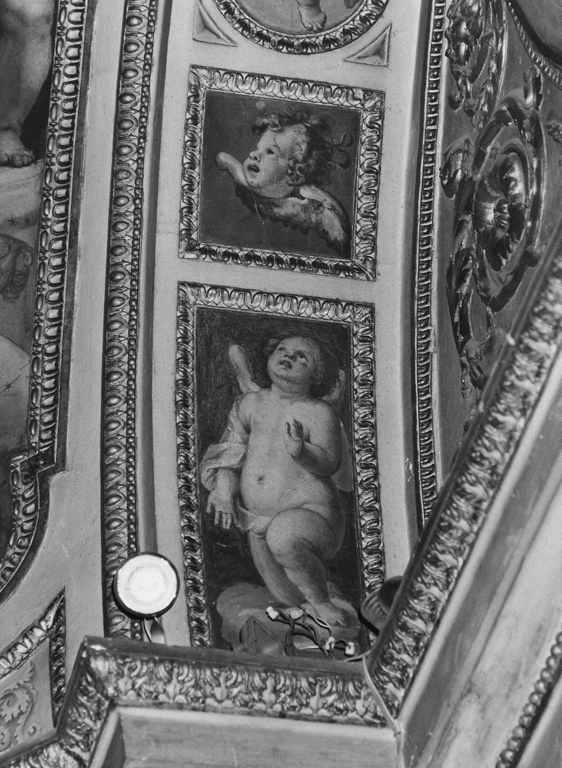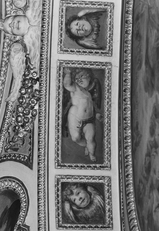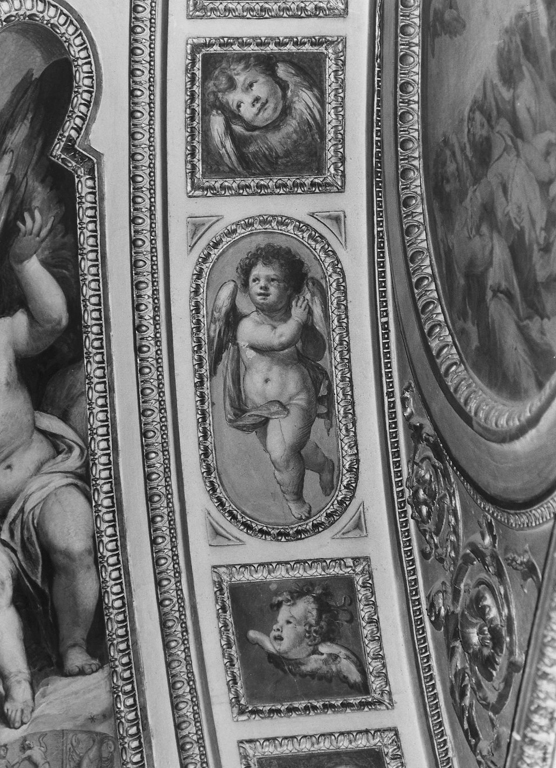 In spazi rettangolari, quadrati e ovali, delineati da una cornice in stucco decorata a fogliette lanceolate, si alternano putti e cherubini