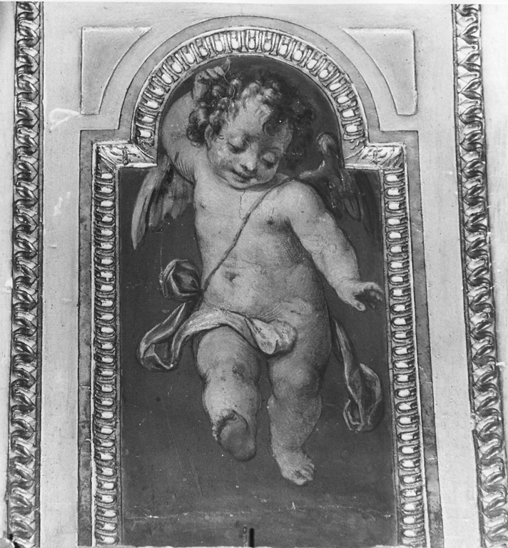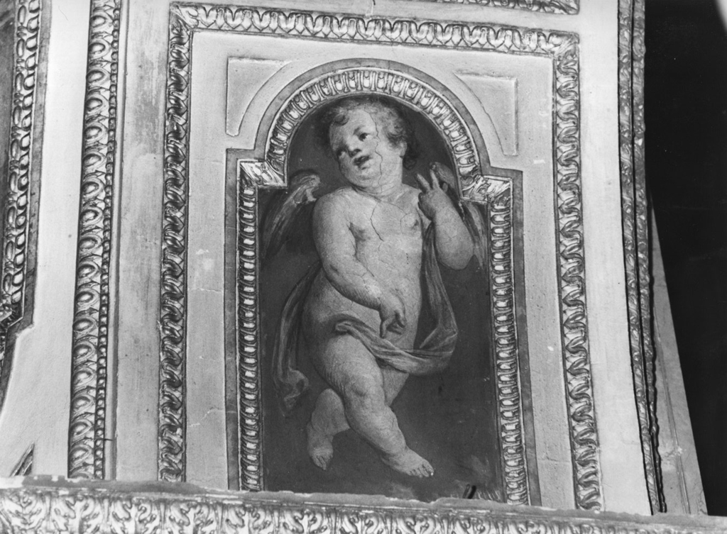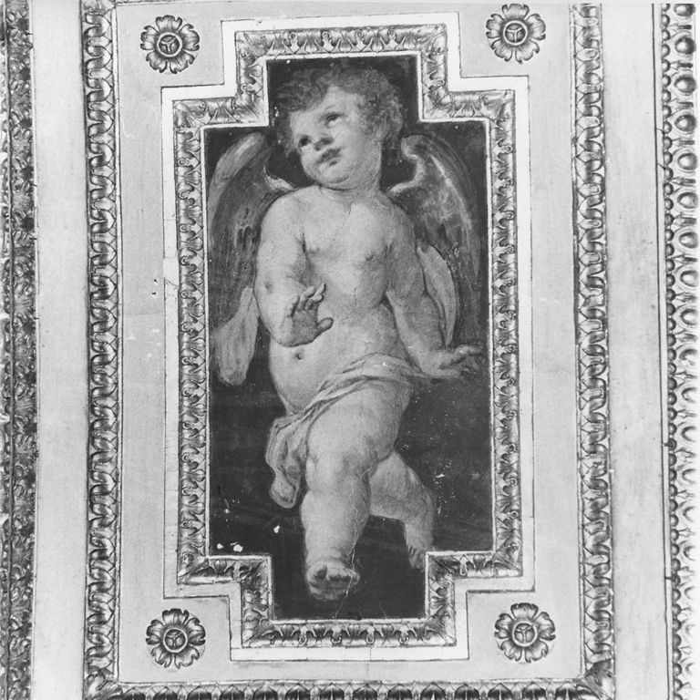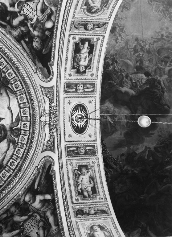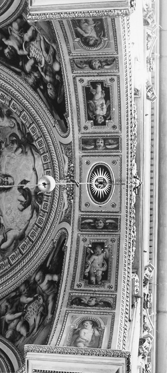 Al centro entro una cartella rettangolare con cornice decorata a fogliette lanceolate è raffigurato il monogramma di Cristo, ai lati entro spazi rettangolari e mistilinei, sempre con cornice decorata con lo stesso motivo, sono cherubini e putti