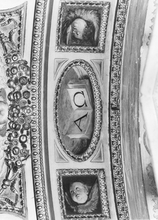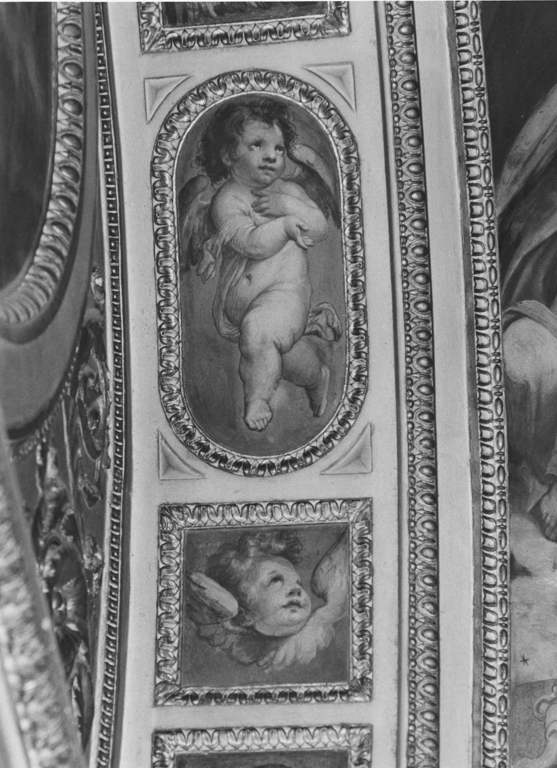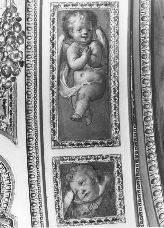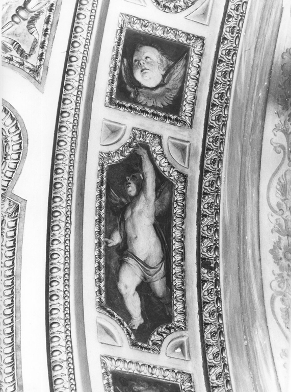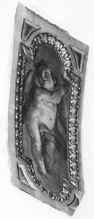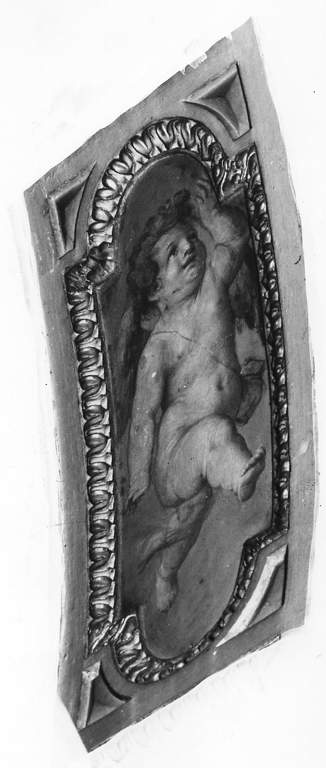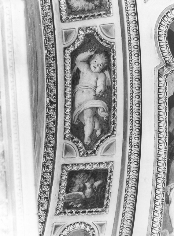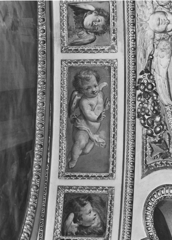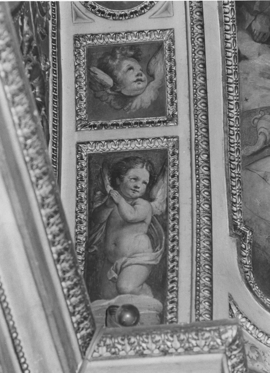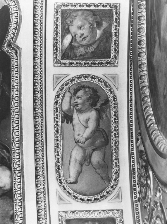 Entro cartelle quadrate, rettangolari e ovali delineate da cornici decorate con motivo a fogliette lanceolate sono raffigurati putti e cherubini