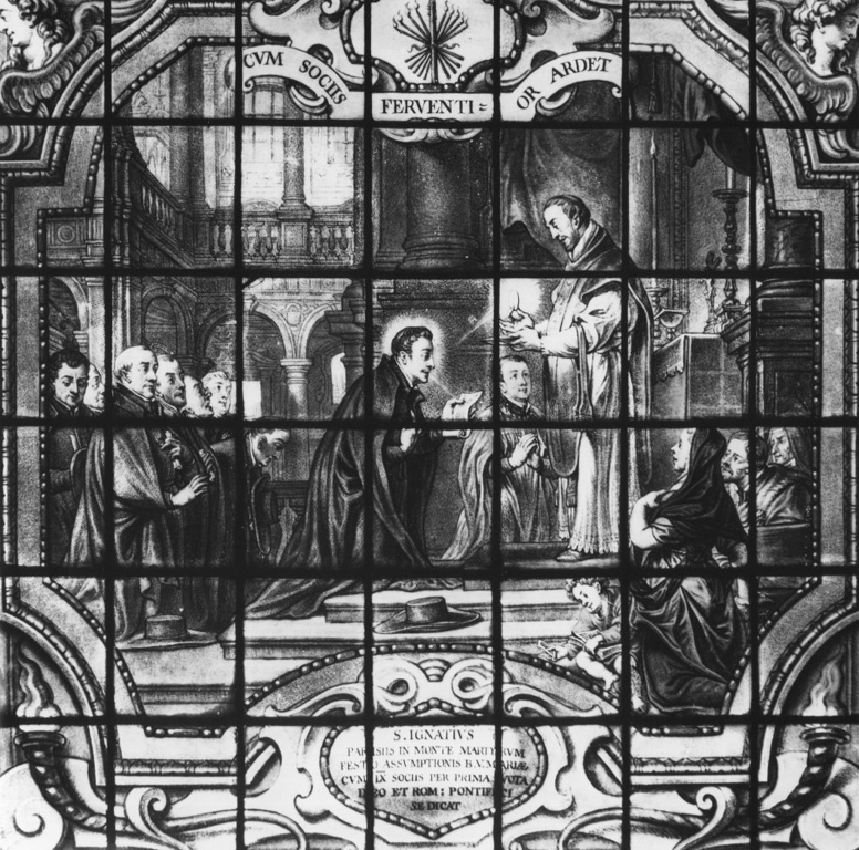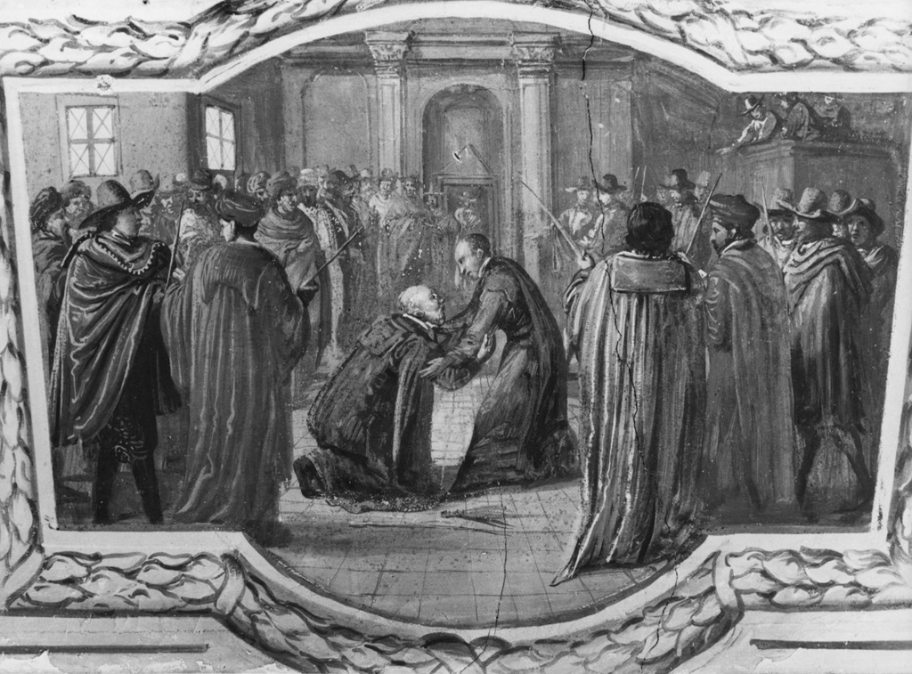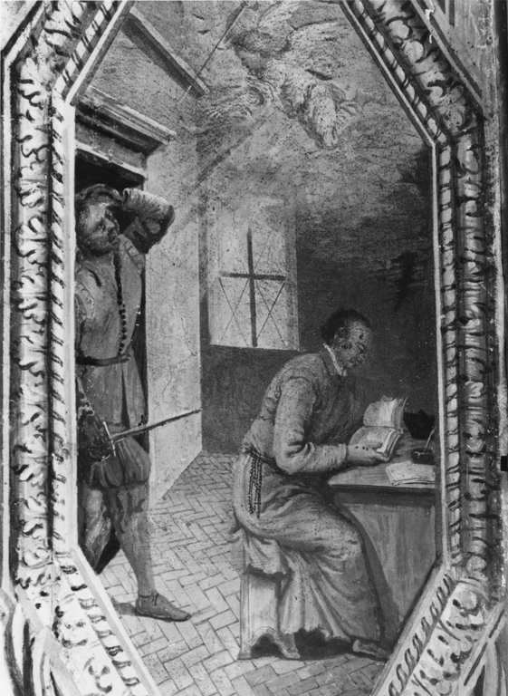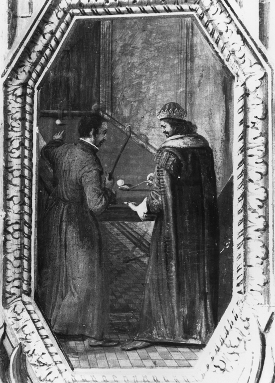 - NOTIZIE STORICO CRITICHE Gli affreschi realizzati dal pittore gesuita Courtois furono alcuni anni dopo la sua morte (1676), integrati e inseriti da fratel Pozzo nella sua decorazione prospettica. Durante i lavori di restauro del 1990-1991 nel vano della finestra dell'atrio davanti alla galleria, sono state rinvenute sotto sette strati di vernice tracce di decorazione fatte in tempera a secco, paragonabili a quelle eseguite dal Borgognone all'interno della galleria. Per mancanza di finanziamenti, il difficile lavoro di recupero rimane ancora da fare