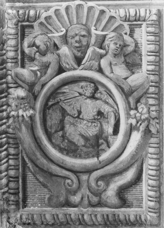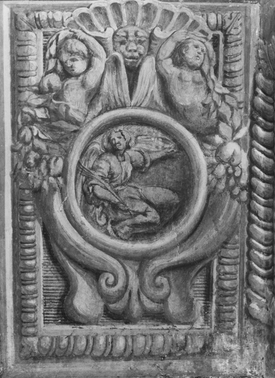 Lo spazio rettangolare sotto la finestra è occupato da un episodio relativo alla vita del Santo entro cornice mistilinea. Ai lati negli strombi inferiori della finestra, delle figure angeliche, entro una ricca decorazione a volute. Negli strombi superiori due scene sempre relative ad episodi salienti della vita del Santo inquadrati in una decorazione a candelabra. Al centro della finestra, nella parte superiore, una vetrata dipinta. Sopra la finestra un ulteriore episodio dellla vita del santo