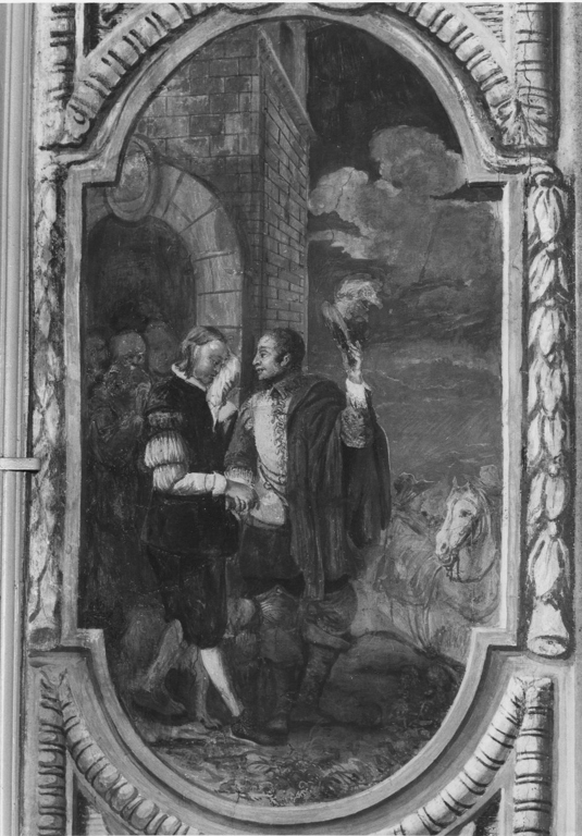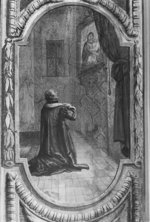 - NOTIZIE STORICO CRITICHE Gli affreschi realizzati dal pittore gesuita Courtois furono alcuni anni dopo la sua morte (1676), integrati e inseriti da fratel Pozzo nella sua decorazione prospettica. Durante i lavori di restauro del 1990-1991 nel vano della finestra dell'atrio davanti alla galleria, sono state rinvenute sotto sette strati di vernice tracce di decorazione fatte in tempera a secco, paragonabili a quelle eseguite dal Borgognone all'interno della galleria. Per mancanza di finanziamenti, il difficile lavoro di recupero rimane ancora da fare