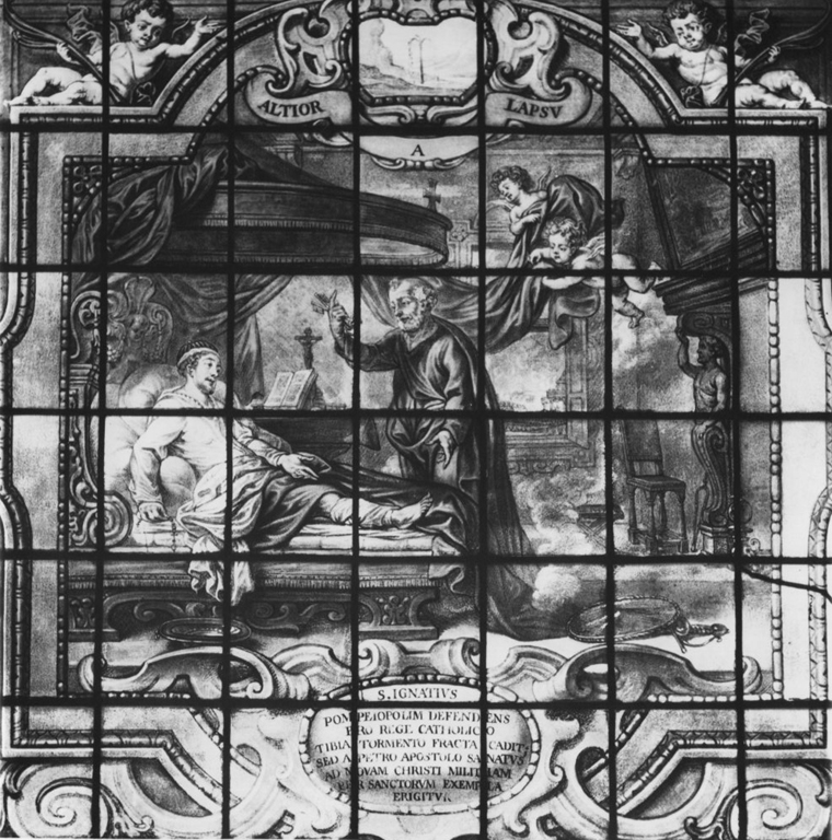 Storie della Vita di Sant'Ignazio:La battaglia di Pamplona;Sant'Ignazio che lascia la sua famiglia;Sant'Ignazio in preghiera davanti all'immagine della Madonna col Bambino;San Pietro guarisce Sant'Ignazio;Sant'Ignazio davanti alla Madonna col Bambino