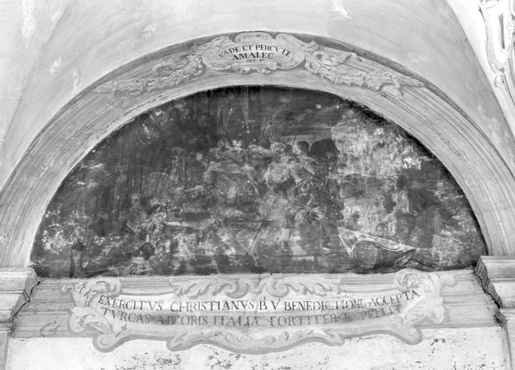 - NOTIZIE STORICO CRITICHE Secondo la Balsamo (1984), l'affresco attualmente visibile è opera della fine del'600 primi del '700, di un artista sconosciuto. Ugualmente sconosciuto l'artista che ha eseguito entro il 1584 la scena sottostante, di cui conosciamo composizione e soggetto solo grazie all'incisione del Brambilla