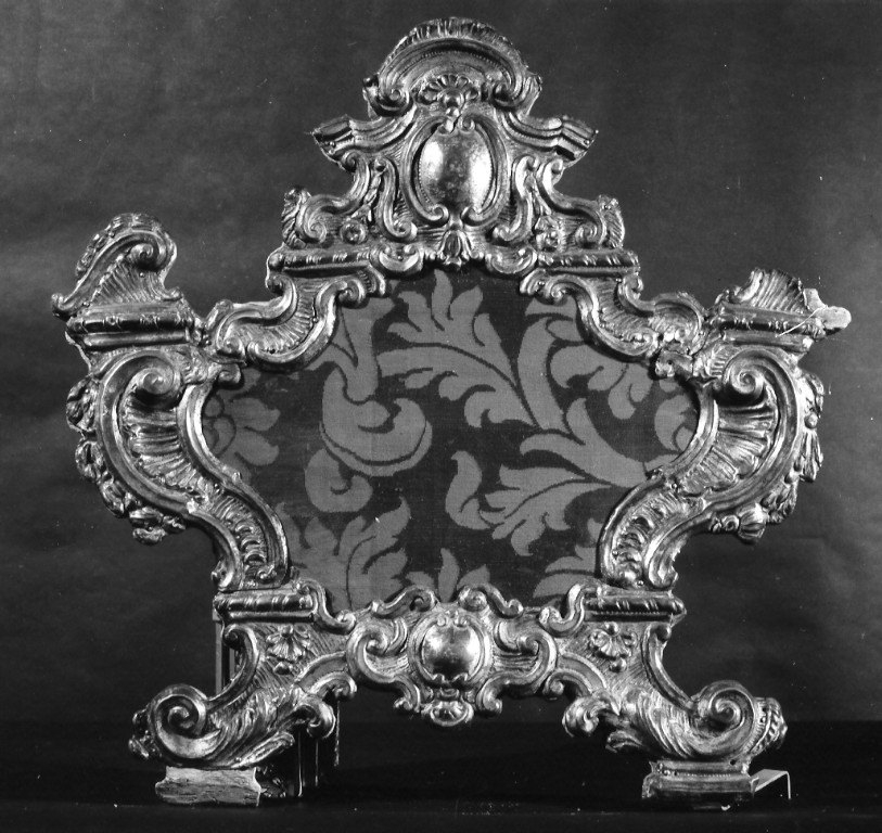 La cartagloria poggia su due piedi a voluta fitomorfa. La cornice è decorata da volute vegetali e al centro, in basso e in alto, scudi con specchiature lisce