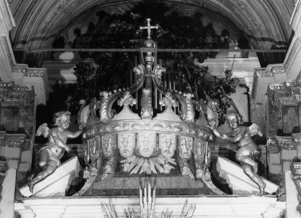 la struttura a forma di corona è addossata all'edicola centrale del timpano dell'altare; sormontata da due volute vegetali concluse alla sommità da una croce; inferiormente è decorata da medaglioni ovali includenti rosette, pendenti con motivi vegetali a rilievo e pennacchi; ai lati, collocati sugli spioventi del timpano spezzato, sono due putti alati dalla bocca aperta